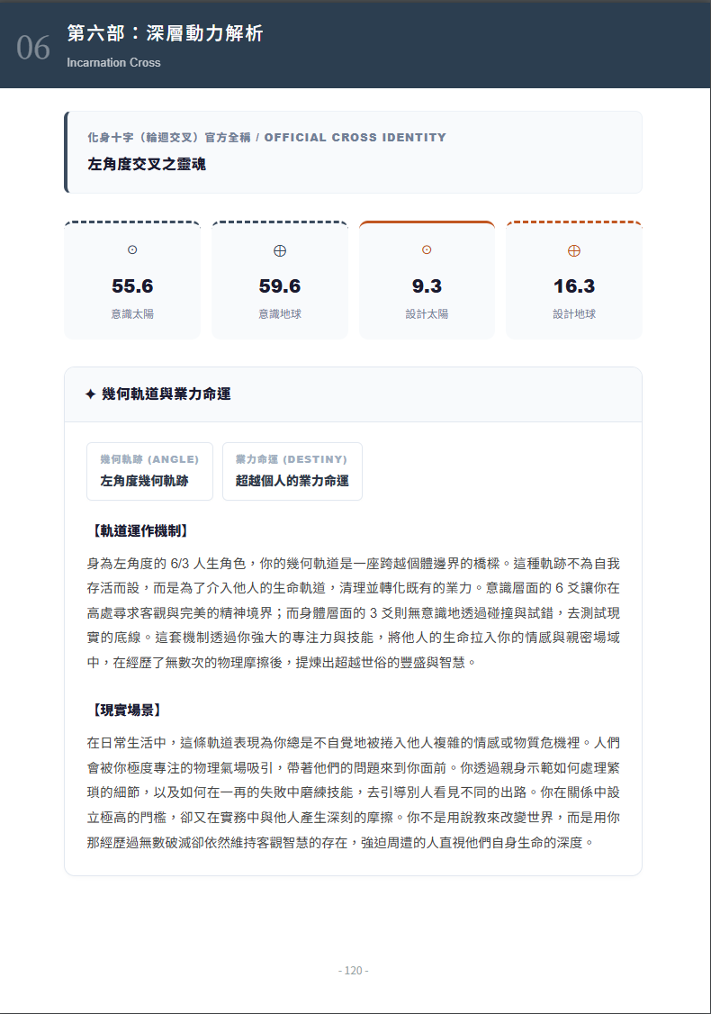 至於為什麼 Human Design 這一部分聚焦在化身十字,是因為化身十字本來就是整張圖裡,最能代表一個人此生方向與核心主題的位置。在這份整合報告裡,我們需要的不是把所有細節一次展開,而是先抓住最能代表你生命方向的那個核心,讓它和另外兩套系統一起工作。這樣整合出來的結果,才會比單看任何一套系統都更完整。