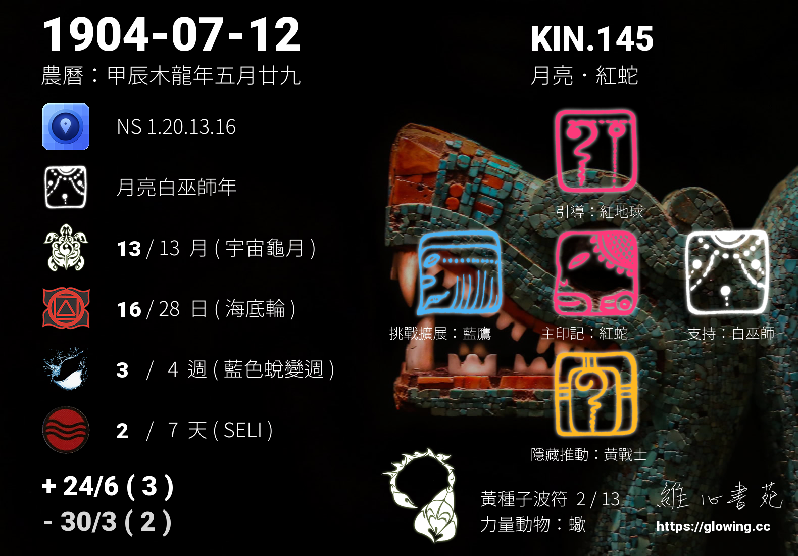 我們可以稱 KIN 145 為 【月亮紅蛇】 、 【月亮的紅蛇】 、 【黃種子波符 之 月亮紅蛇】 也可以是 【月亮紅蛇.黃種子波符】 ,你比較喜歡哪一個稱號呢?
