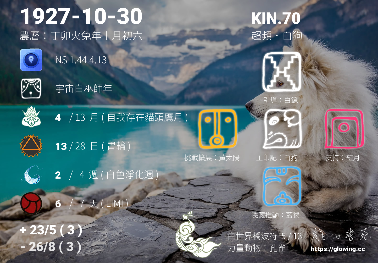 白狗的引導依據KIN的調性不同會有五種可能性,KIN.70的引導圖騰是白鏡 , 白鏡引導著我們認清自我,為我們的未來留下紀錄,將我們每一個思緒紀錄在天體運行中,在我們回歸的那個當下,迴向各所有的存在與眾生,為這個世界留下美麗色彩。
