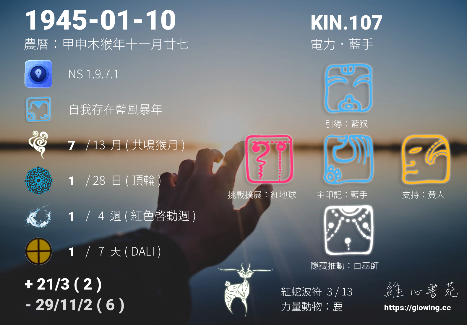 藍手的引導依據KIN的調性不同會有五種可能性,KIN.107的引導圖騰是藍猴 , 在藍猴的引導下,我們徜徉在人生遊樂場的思維下,去體會人生如戲,夢如人生的荒誕喜劇,生命從來就不是嚴肅的課題,嚴肅的鳥不會飛、嚴肅的雞不會叫、嚴肅的人沒有心,嚴肅會導致能量閉塞,沒有心,不會怎樣,就只是沒有滋味平淡人生乾癟而已。