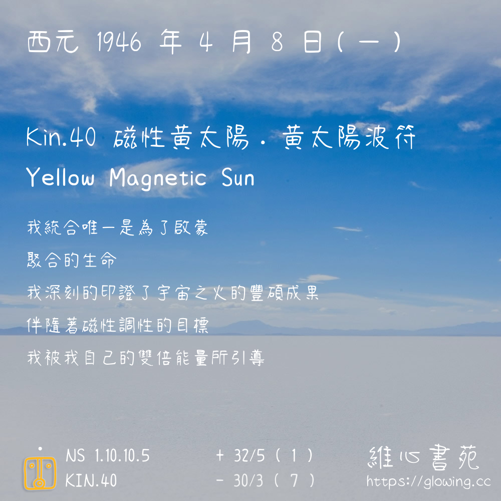 我們可以稱 KIN 40 為 【磁性黃太陽】 、 【磁性的黃太陽】 、 【黃太陽波符 之 磁性黃太陽】 也可以是 【磁性黃太陽.黃太陽波符】 ,你比較喜歡哪一個稱號呢?