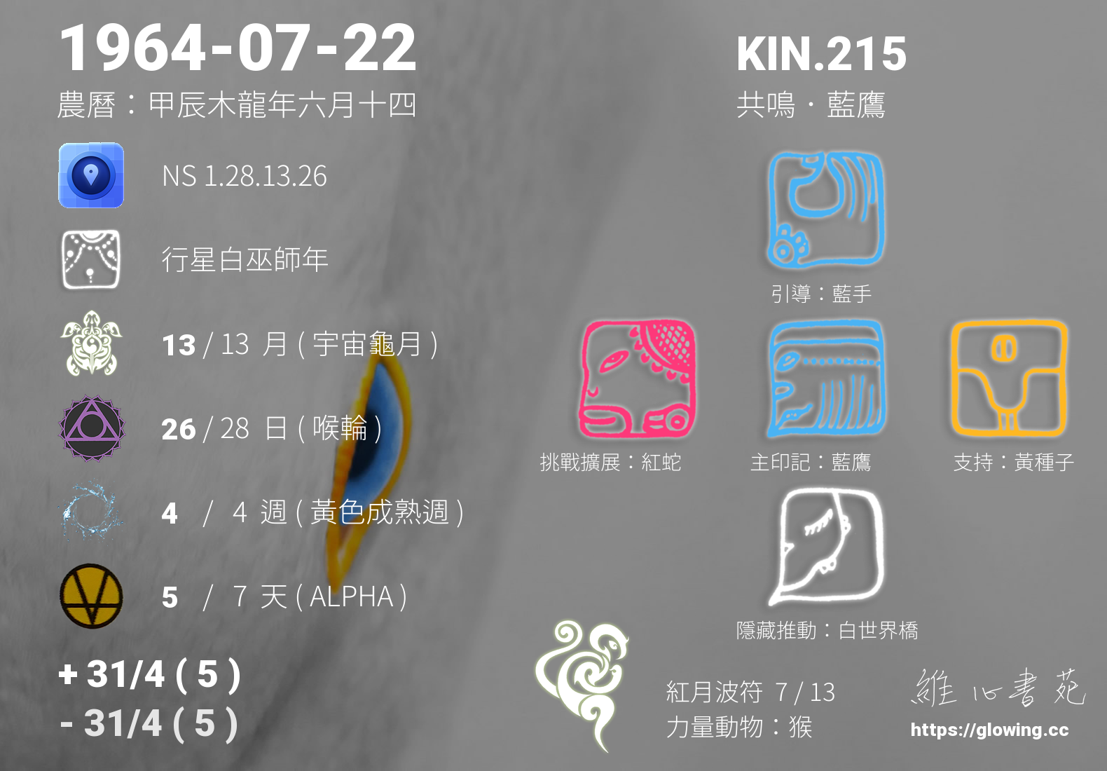 我們可以稱 KIN 215 為 【共鳴藍鷹】 、 【共鳴的藍鷹】 、 【紅月波符 之 共鳴藍鷹】 也可以是 【共鳴藍鷹.紅月波符】 ,你比較喜歡哪一個稱號呢?