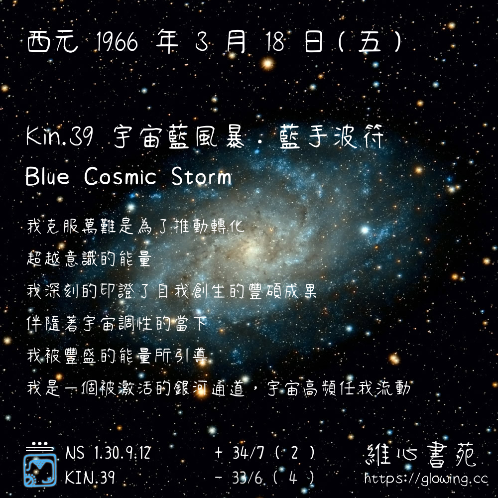 我們可以稱 KIN 39 為 【宇宙藍風暴】 、 【宇宙的藍風暴】 、 【藍手波符 之 宇宙藍風暴】 也可以是 【宇宙藍風暴.藍手波符】 ,你比較喜歡哪一個稱號呢?