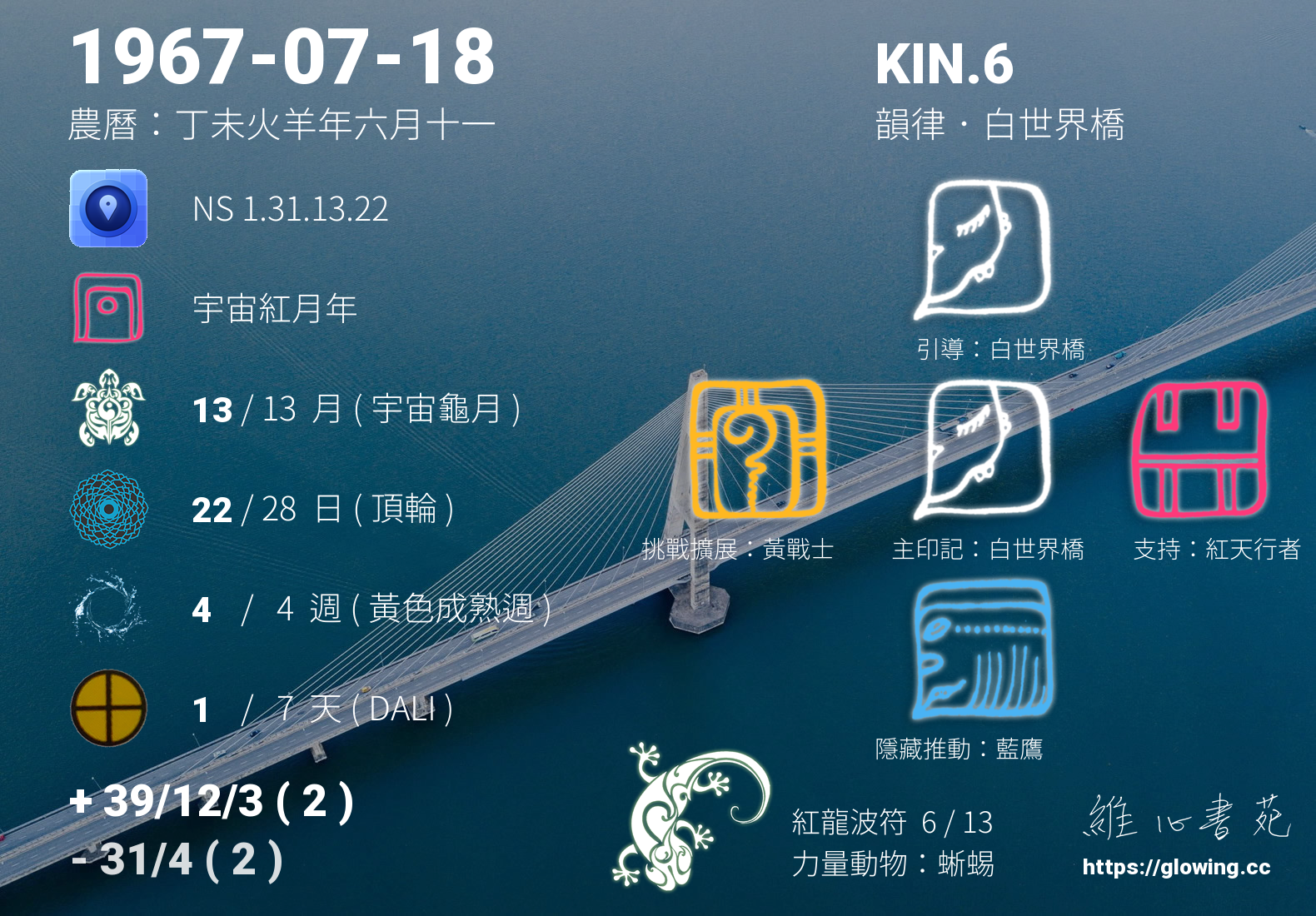 我們可以稱 KIN 6 為 【韻律白世界橋】 、 【韻律的白世界橋】 、 【紅龍波符 之 韻律白世界橋】 也可以是 【韻律白世界橋.紅龍波符】 ,你比較喜歡哪一個稱號呢?