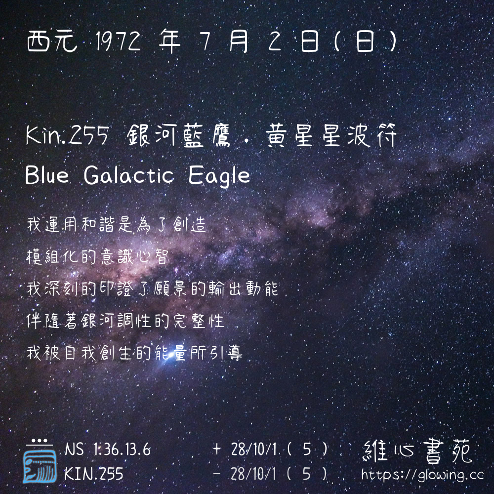 我們可以稱 KIN 255 為 【銀河藍鷹】 、 【銀河的藍鷹】 、 【黃星星波符 之 銀河藍鷹】 也可以是 【銀河藍鷹.黃星星波符】 ,你比較喜歡哪一個稱號呢?