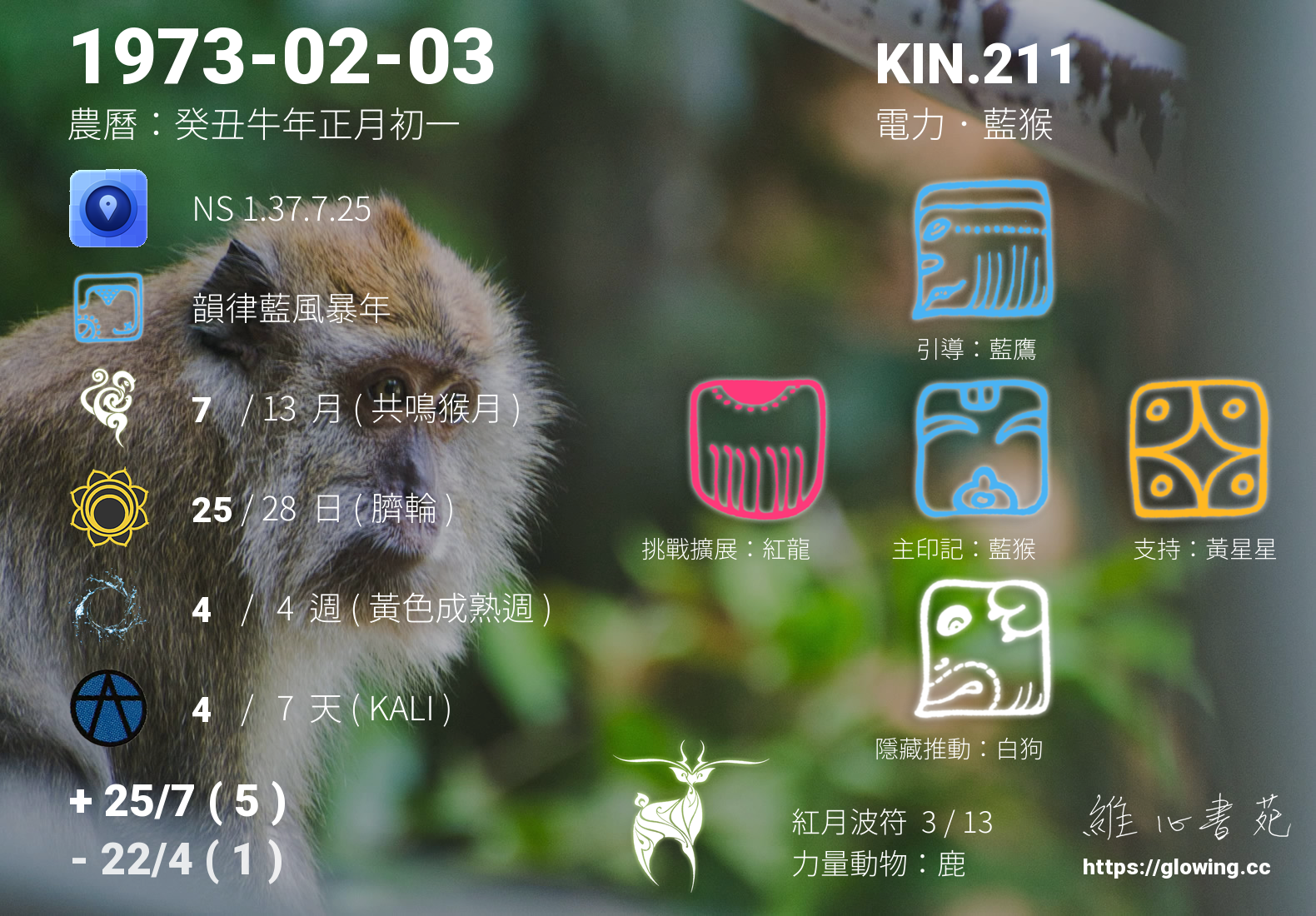 我們可以稱 KIN 211 為 【電力藍猴】 、 【電力的藍猴】 、 【紅月波符 之 電力藍猴】 也可以是 【電力藍猴.紅月波符】 ,你比較喜歡哪一個稱號呢?