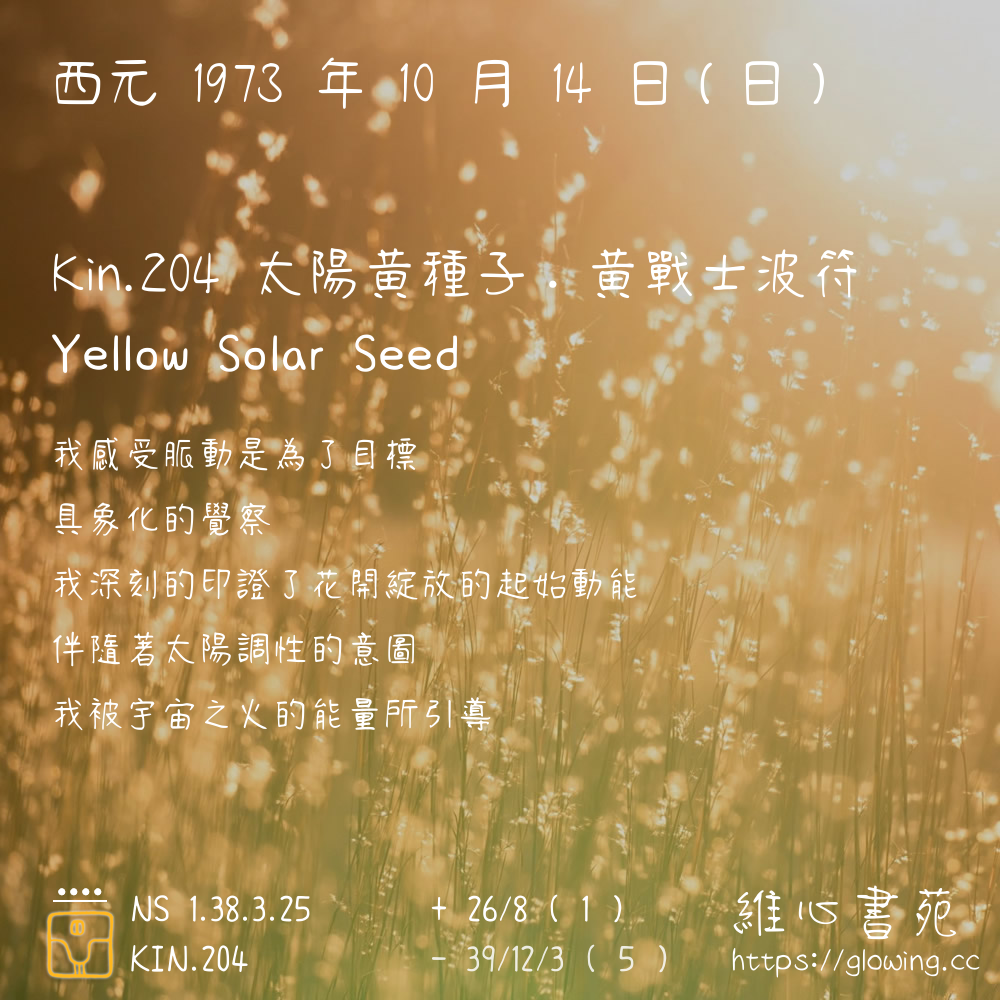 我們可以稱 KIN 204 為 【太陽黃種子】 、 【太陽的黃種子】 、 【黃戰士波符 之 太陽黃種子】 也可以是 【太陽黃種子.黃戰士波符】 ,你比較喜歡哪一個稱號呢?