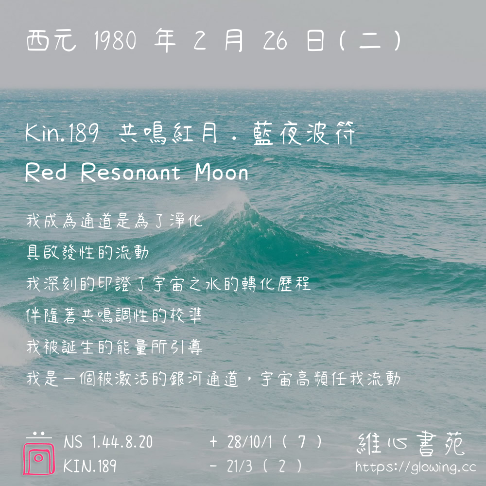 我們可以稱 KIN 189 為 【共鳴紅月】 、 【共鳴的紅月】 、 【藍夜波符 之 共鳴紅月】 也可以是 【共鳴紅月.藍夜波符】 ,你比較喜歡哪一個稱號呢?