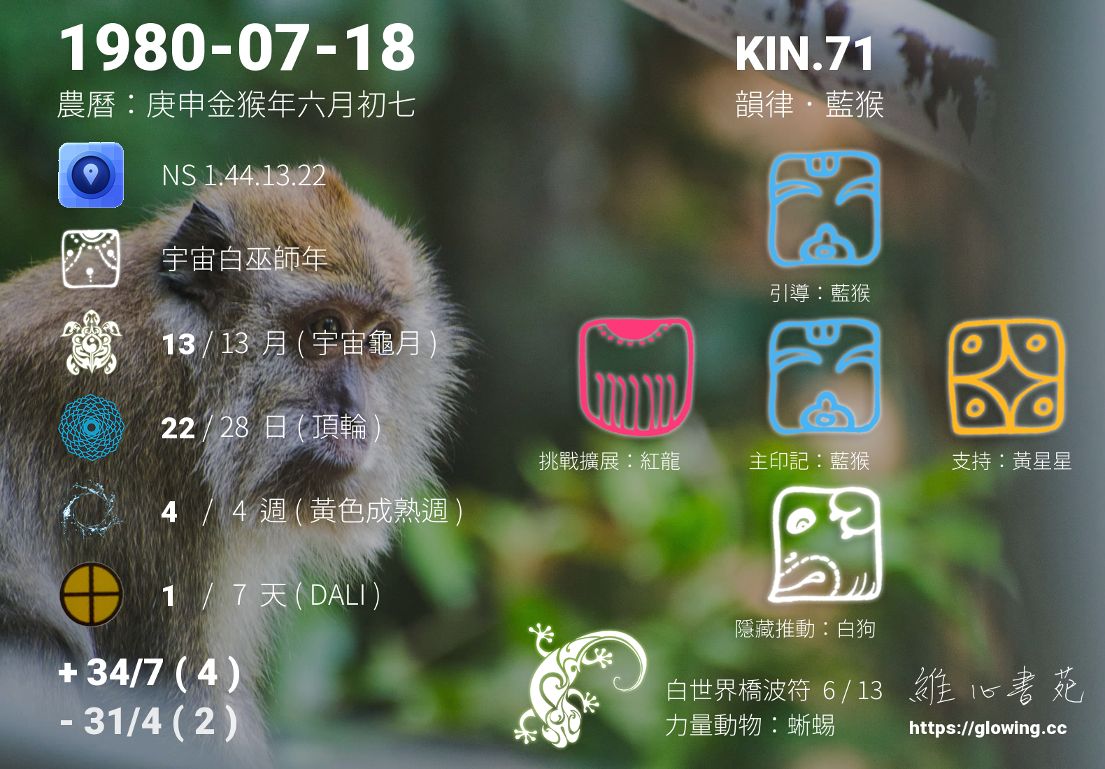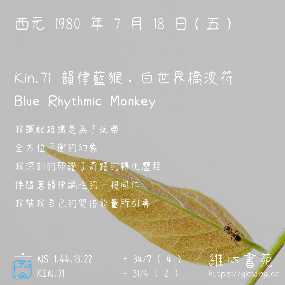 我們可以稱 KIN 71 為 【韻律藍猴】 、 【韻律的藍猴】 、 【白世界橋波符 之 韻律藍猴】 也可以是 【韻律藍猴.白世界橋波符】 ,你比較喜歡哪一個稱號呢?