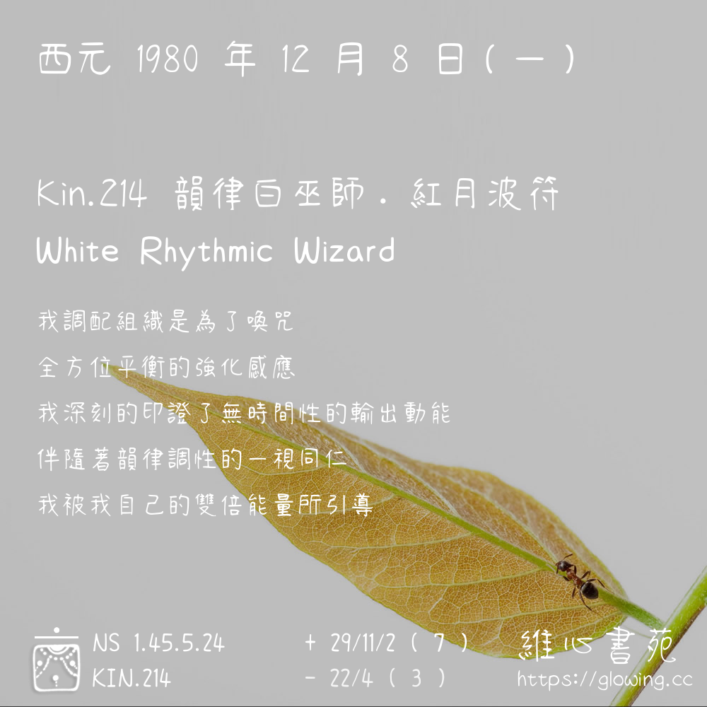 我們可以稱 KIN 214 為 【韻律白巫師】 、 【韻律的白巫師】 、 【紅月波符 之 韻律白巫師】 也可以是 【韻律白巫師.紅月波符】 ,你比較喜歡哪一個稱號呢?