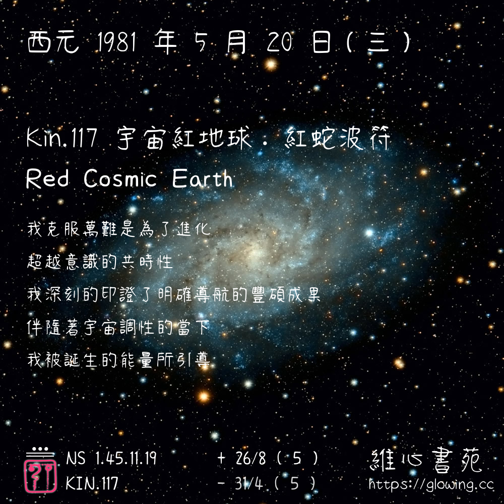 我們可以稱 KIN 117 為 【宇宙紅地球】 、 【宇宙的紅地球】 、 【紅蛇波符 之 宇宙紅地球】 也可以是 【宇宙紅地球.紅蛇波符】 ,你比較喜歡哪一個稱號呢?