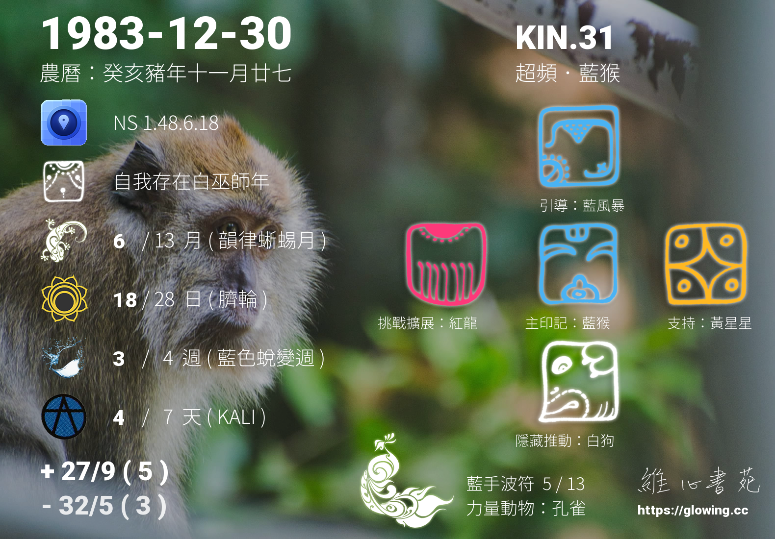 我們可以稱 KIN 31 為 【超頻藍猴】 、 【超頻的藍猴】 、 【藍手波符 之 超頻藍猴】 也可以是 【超頻藍猴.藍手波符】 ,你比較喜歡哪一個稱號呢?