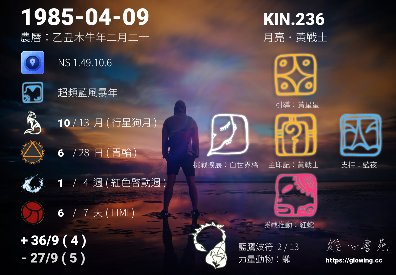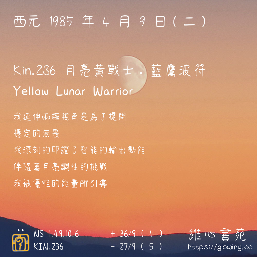 我們可以稱 KIN 236 為 【月亮黃戰士】 、 【月亮的黃戰士】 、 【藍鷹波符 之 月亮黃戰士】 也可以是 【月亮黃戰士.藍鷹波符】 ,你比較喜歡哪一個稱號呢?