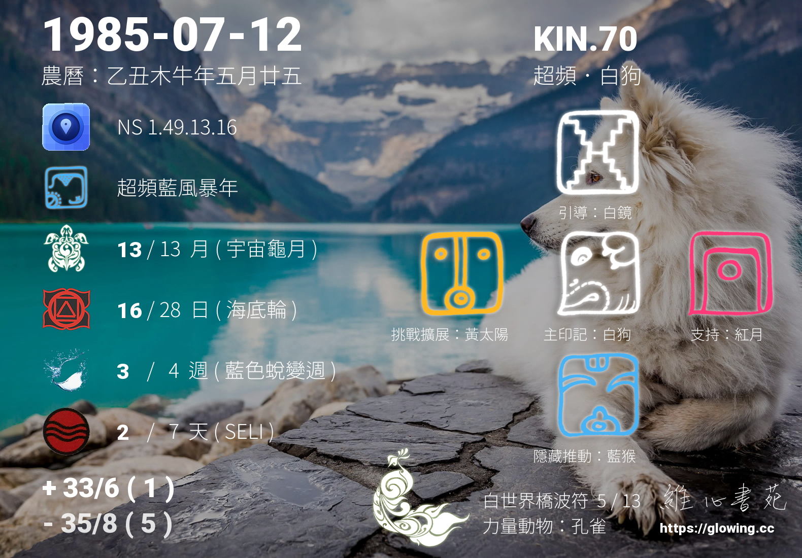 我們可以稱 KIN 70 為 【超頻白狗】 、 【超頻的白狗】 、 【白世界橋波符 之 超頻白狗】 也可以是 【超頻白狗.白世界橋波符】 ,你比較喜歡哪一個稱號呢?