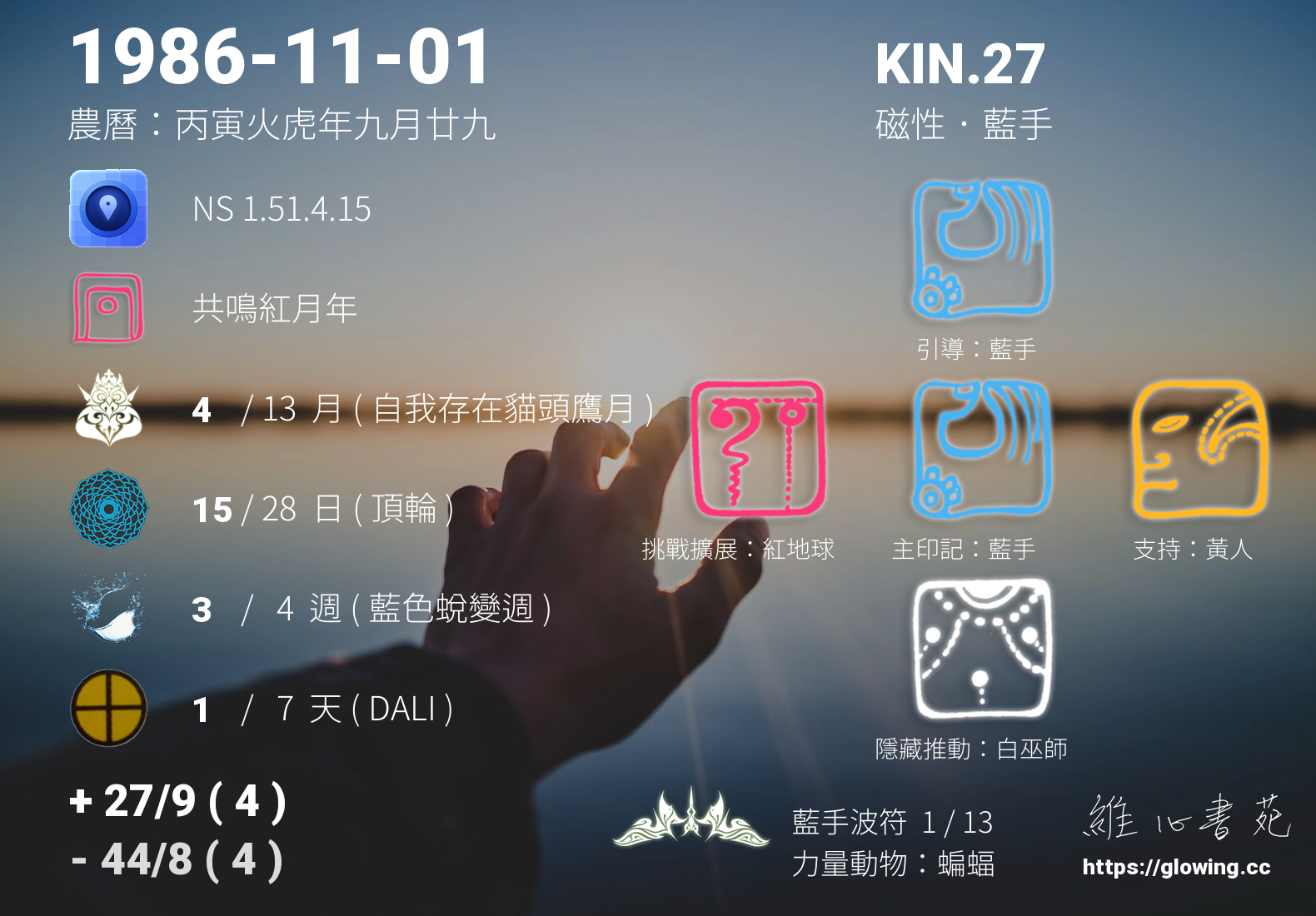 藍手的引導依據KIN的調性不同會有五種可能性,KIN.27的引導圖騰是藍手 , 在藍手的引導下,我能夠體會手做的思念與情感的船幡,生命的連結不只是具象體驗,在藍手的交織下,具象與意象充分的交織展現,一切如常健行健美。