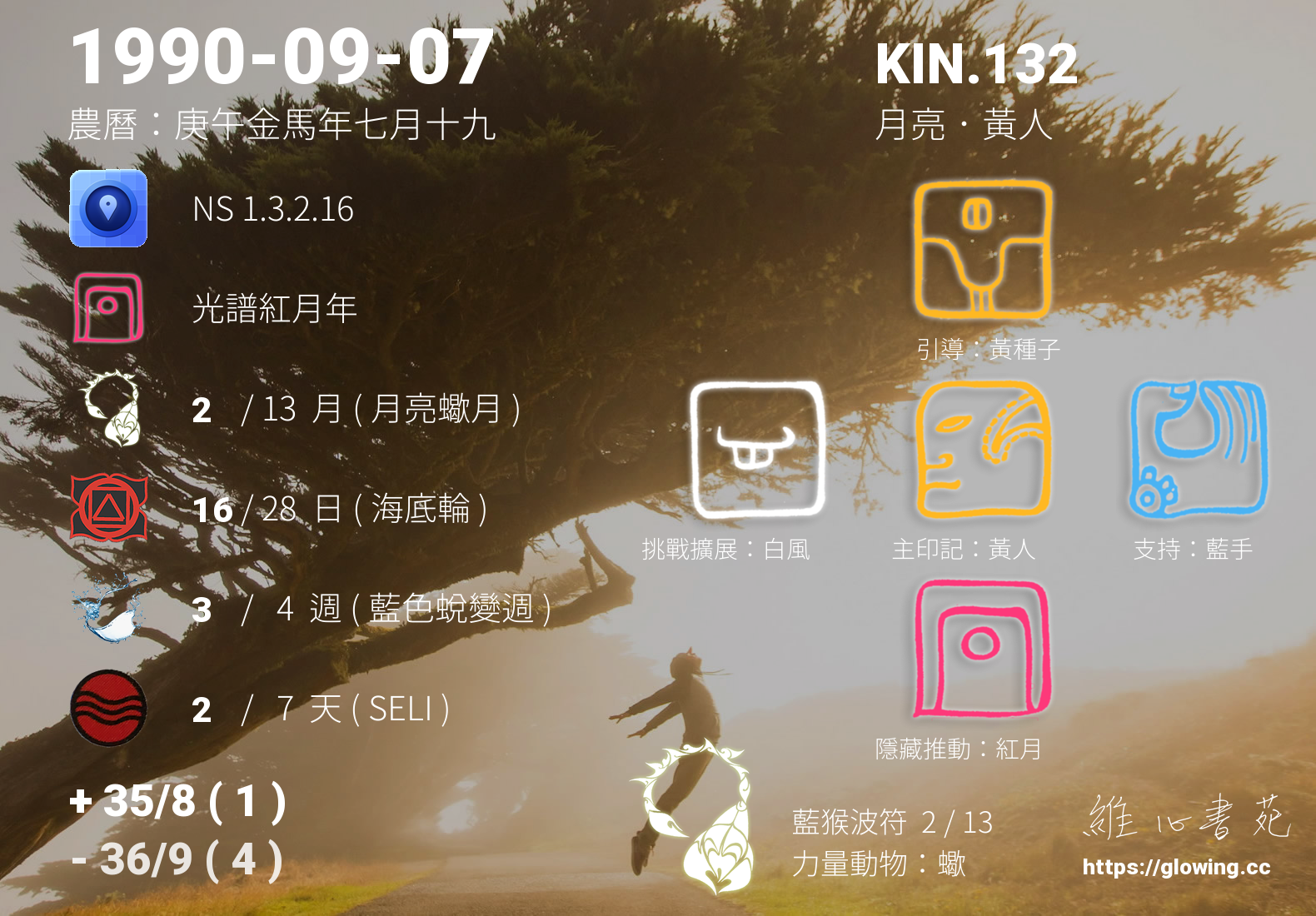 我們可以稱 KIN 132 為 【月亮黃人】 、 【月亮的黃人】 、 【藍猴波符 之 月亮黃人】 也可以是 【月亮黃人.藍猴波符】 ,你比較喜歡哪一個稱號呢?