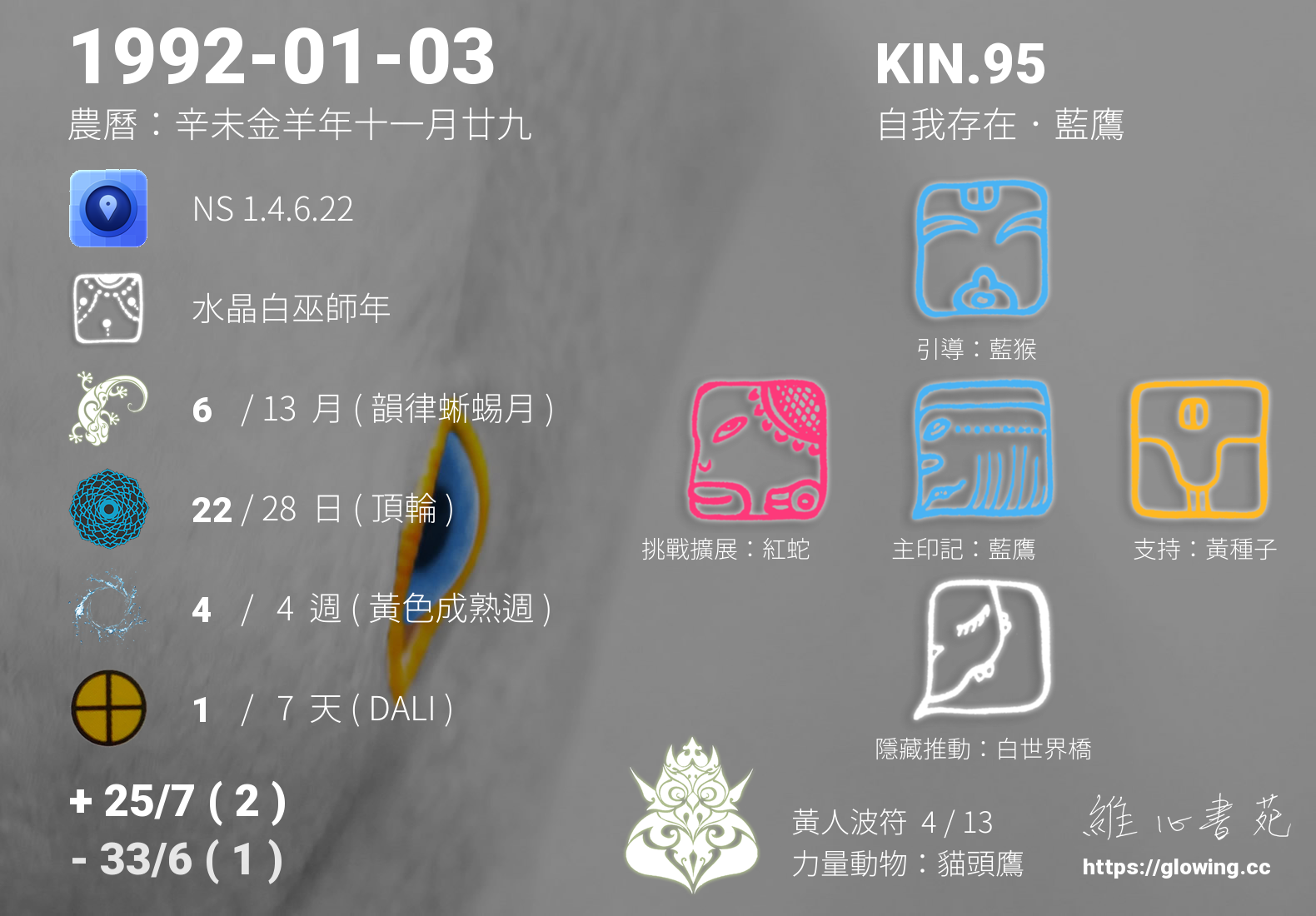 我們可以稱 KIN 95 為 【自我存在藍鷹】 、 【自我存在的藍鷹】 、 【黃人波符 之 自我存在藍鷹】 也可以是 【自我存在藍鷹.黃人波符】 ,你比較喜歡哪一個稱號呢?