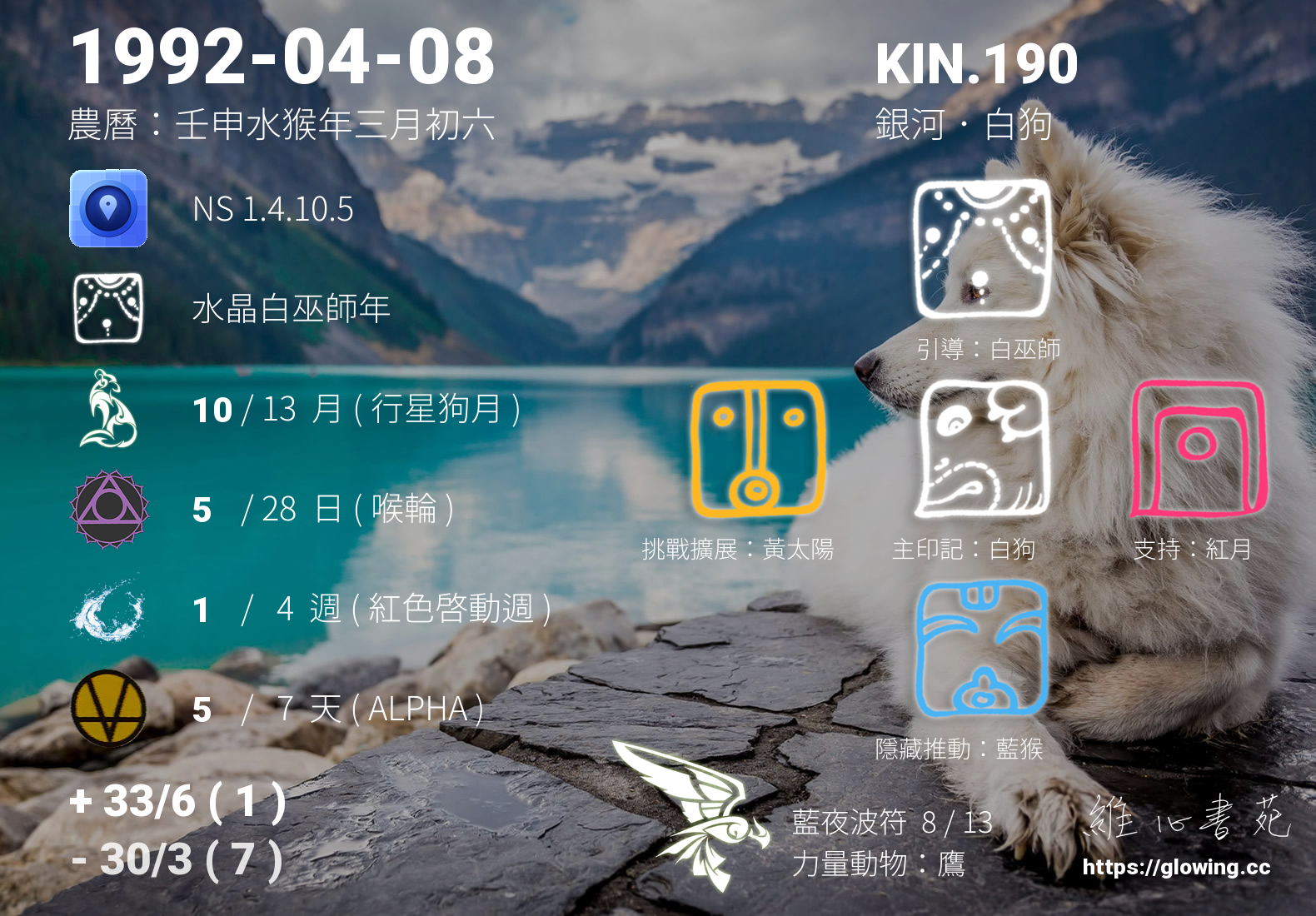 我們可以稱 KIN 190 為 【銀河白狗】 、 【銀河的白狗】 、 【藍夜波符 之 銀河白狗】 也可以是 【銀河白狗.藍夜波符】 ,你比較喜歡哪一個稱號呢?