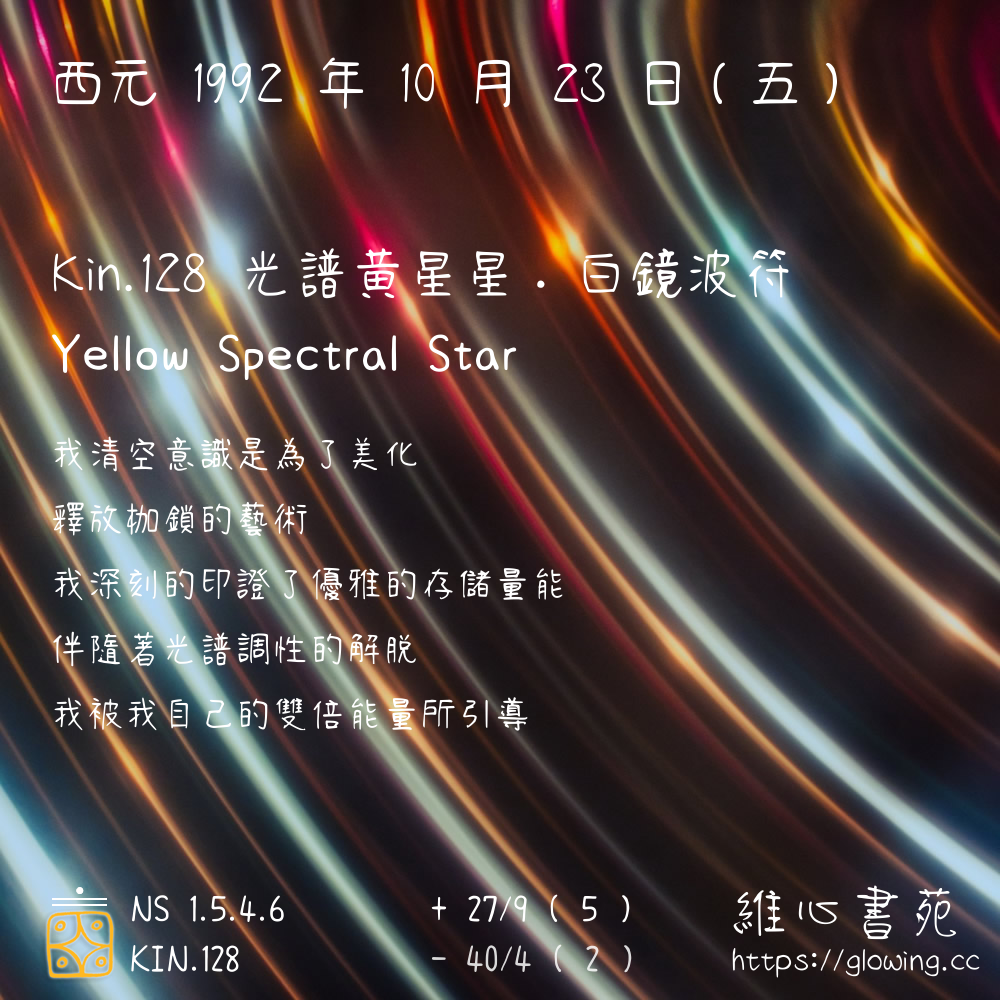 我們可以稱 KIN 128 為 【光譜黃星星】 、 【光譜的黃星星】 、 【白鏡波符 之 光譜黃星星】 也可以是 【光譜黃星星.白鏡波符】 ,你比較喜歡哪一個稱號呢?