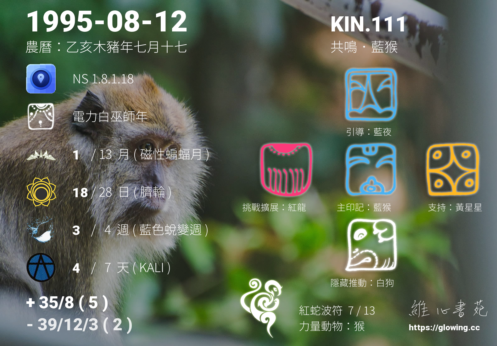 我們可以稱 KIN 111 為 【共鳴藍猴】 、 【共鳴的藍猴】 、 【紅蛇波符 之 共鳴藍猴】 也可以是 【共鳴藍猴.紅蛇波符】 ,你比較喜歡哪一個稱號呢?