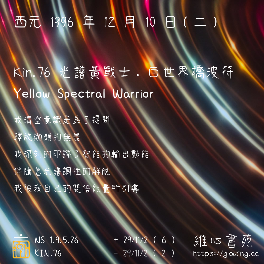 我們可以稱 KIN 76 為 【光譜黃戰士】 、 【光譜的黃戰士】 、 【白世界橋波符 之 光譜黃戰士】 也可以是 【光譜黃戰士.白世界橋波符】 ,你比較喜歡哪一個稱號呢?