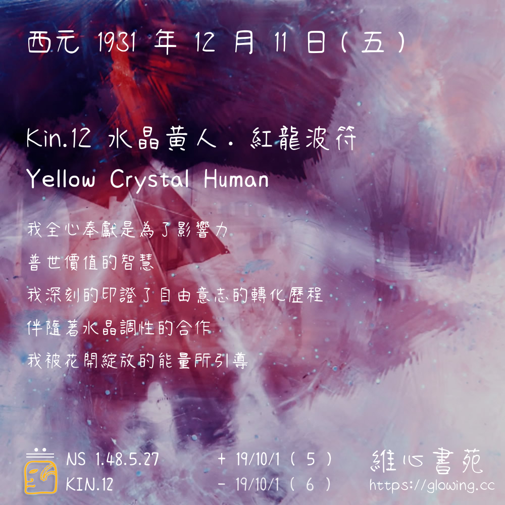 我們可以稱 KIN 12 為 【水晶黃人】 、 【水晶的黃人】 、 【紅龍波符 之 水晶黃人】 也可以是 【水晶黃人.紅龍波符】 ,你比較喜歡哪一個稱號呢?