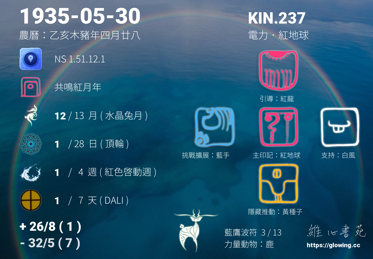 我們可以稱 KIN 237 為 【電力紅地球】 、 【電力的紅地球】 、 【藍鷹波符 之 電力紅地球】 也可以是 【電力紅地球.藍鷹波符】 ,你比較喜歡哪一個稱號呢?