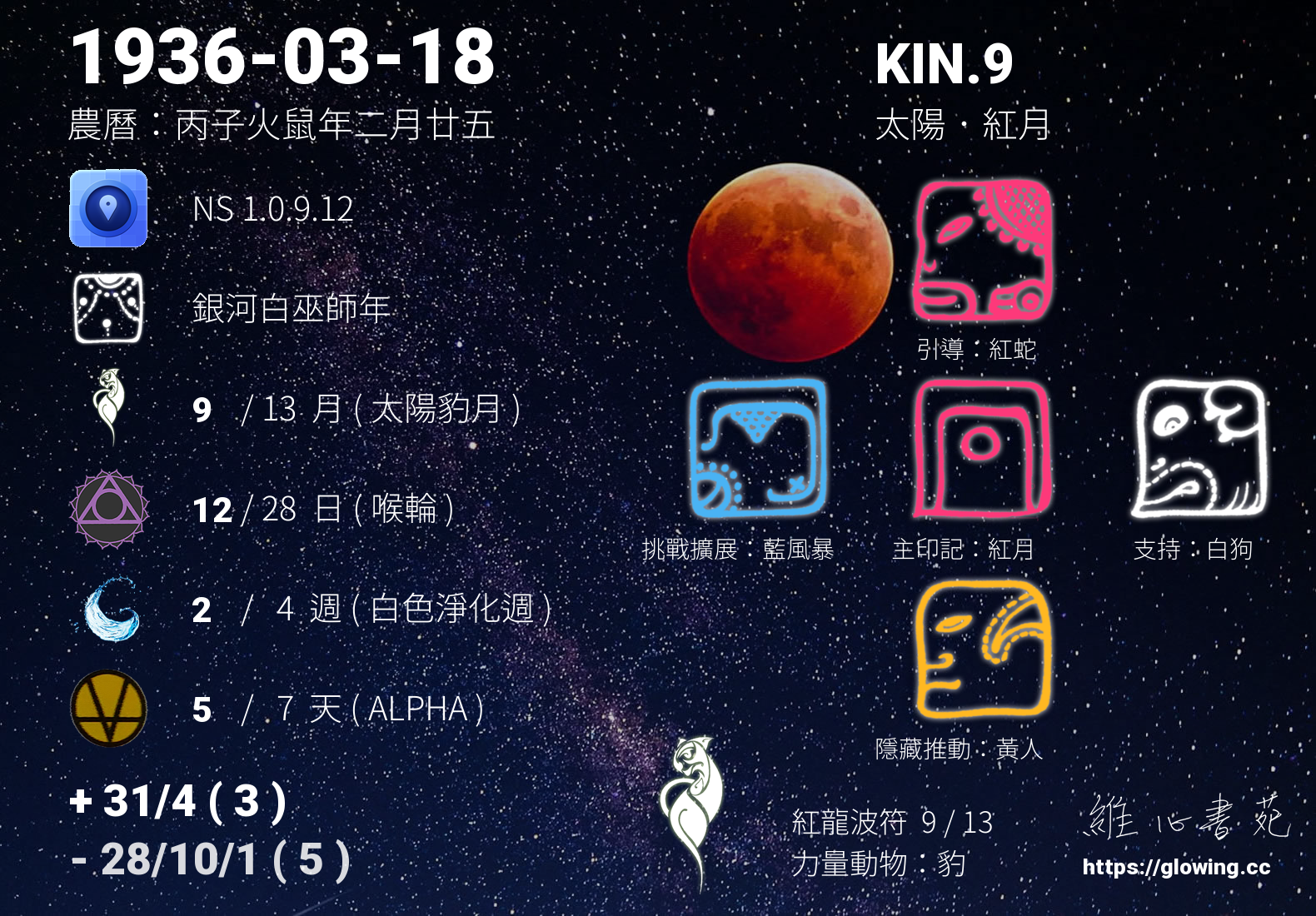 KIN.9 位於 紅龍波符 13 天中的第 9 天,銀河音階為調性 9