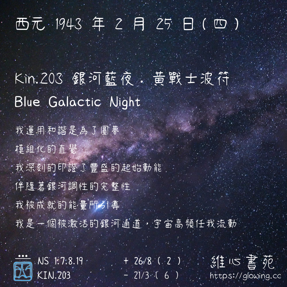 我們可以稱 KIN 203 為 【銀河藍夜】 、 【銀河的藍夜】 、 【黃戰士波符 之 銀河藍夜】 也可以是 【銀河藍夜.黃戰士波符】 ,你比較喜歡哪一個稱號呢?