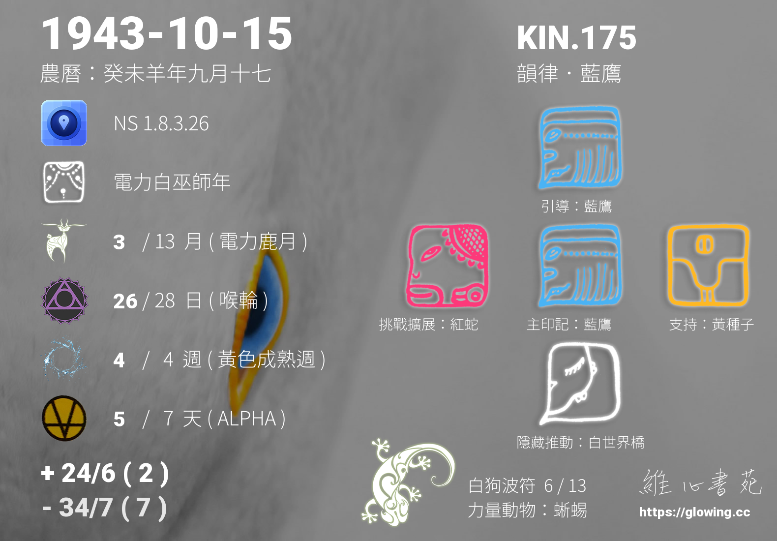 我們可以稱 KIN 175 為 【韻律藍鷹】 、 【韻律的藍鷹】 、 【白狗波符 之 韻律藍鷹】 也可以是 【韻律藍鷹.白狗波符】 ,你比較喜歡哪一個稱號呢?