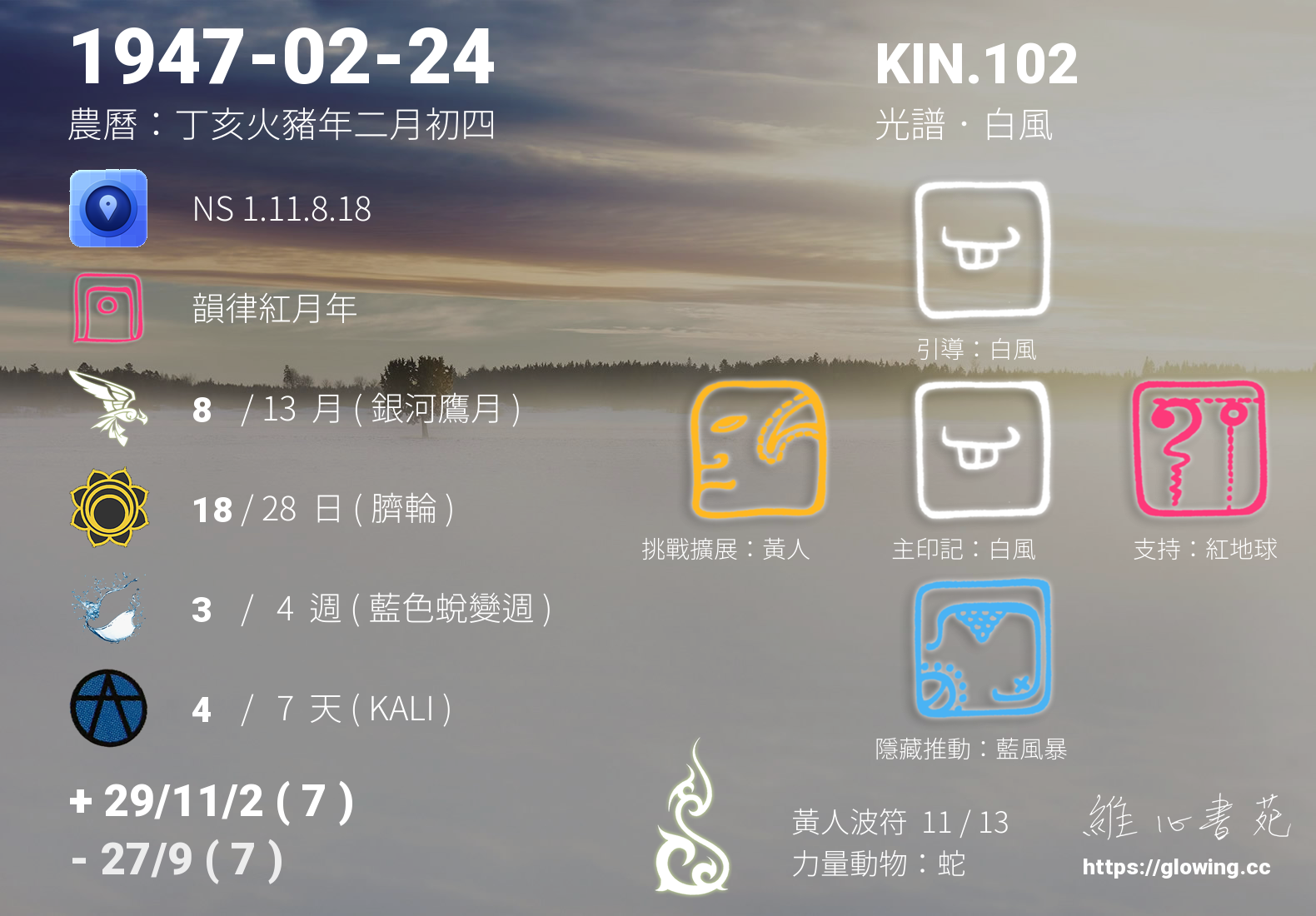 我們可以稱 KIN 102 為 【光譜白風】 、 【光譜的白風】 、 【黃人波符 之 光譜白風】 也可以是 【光譜白風.黃人波符】 ,你比較喜歡哪一個稱號呢?