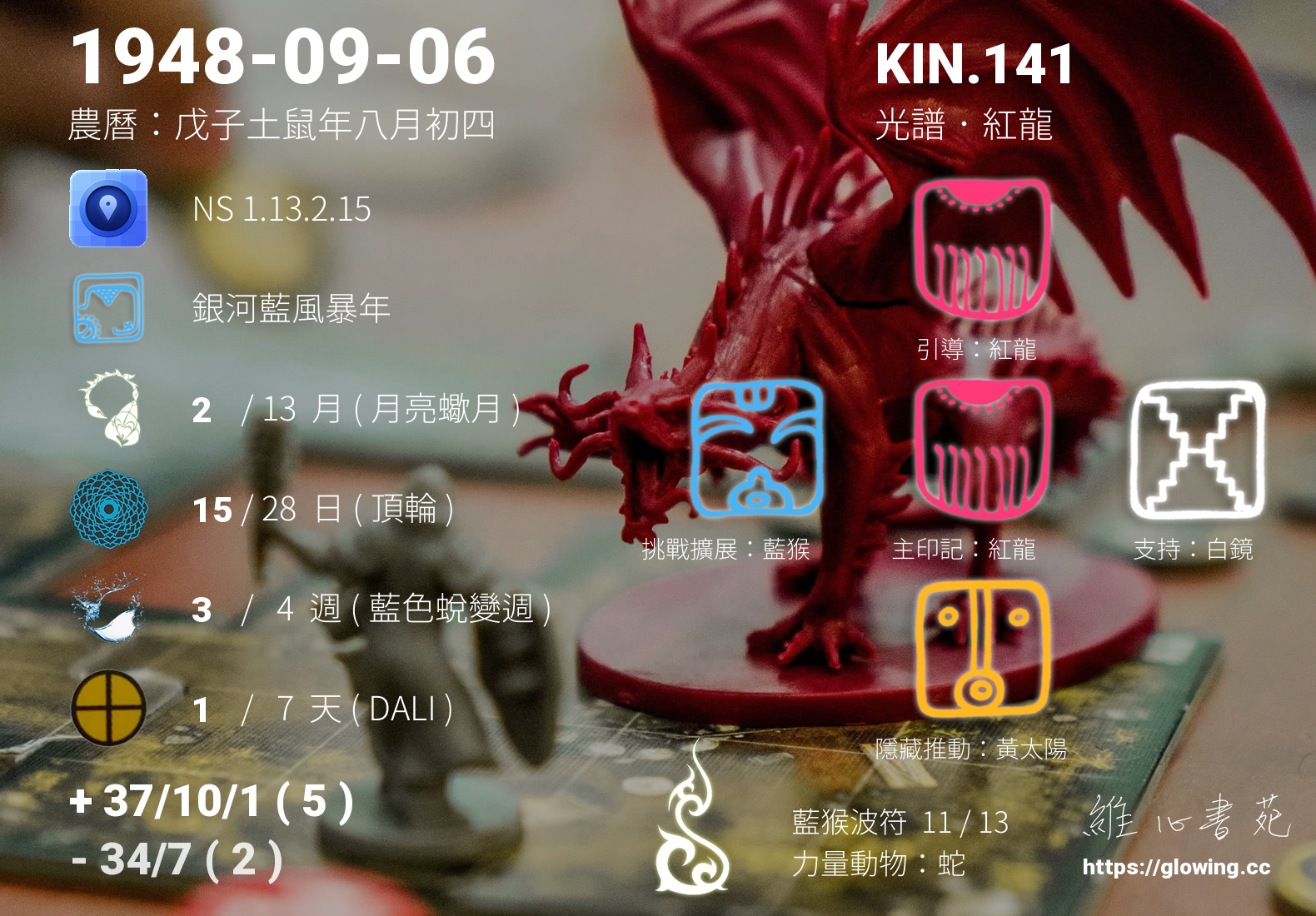 今天的星際原型圖騰為紅龍,我們稱之為主印記, 紅龍是卓爾金曆的第一個圖騰,代表著生命的起源與創造,跟家庭的緣分深刻,動能豐沛。