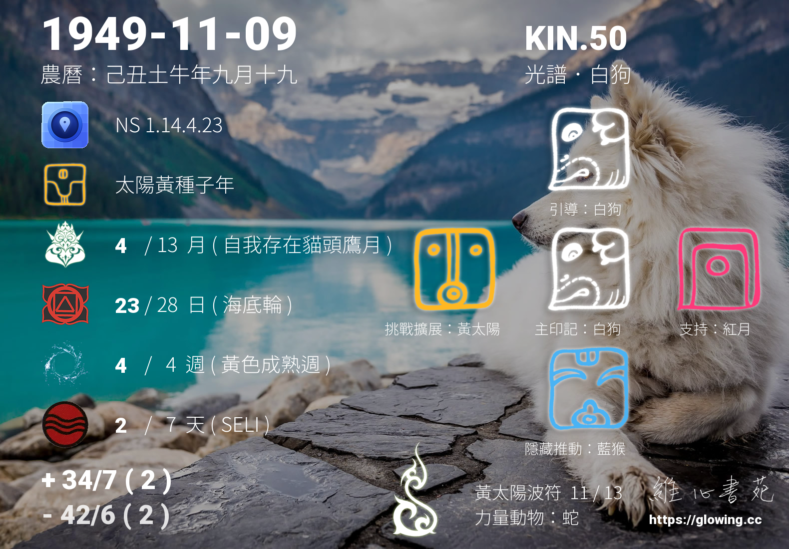 我們可以稱 KIN 50 為 【光譜白狗】 、 【光譜的白狗】 、 【黃太陽波符 之 光譜白狗】 也可以是 【光譜白狗.黃太陽波符】 ,你比較喜歡哪一個稱號呢?