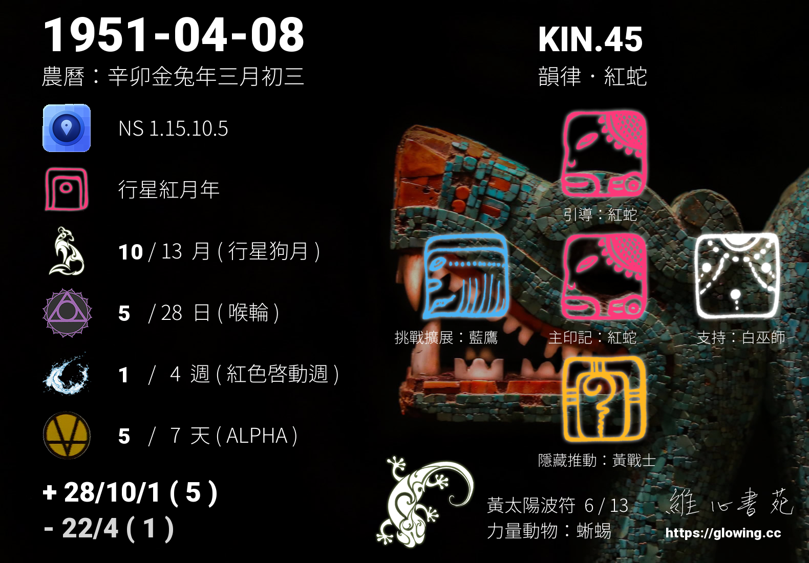 我們可以稱 KIN 45 為 【韻律紅蛇】 、 【韻律的紅蛇】 、 【黃太陽波符 之 韻律紅蛇】 也可以是 【韻律紅蛇.黃太陽波符】 ,你比較喜歡哪一個稱號呢?