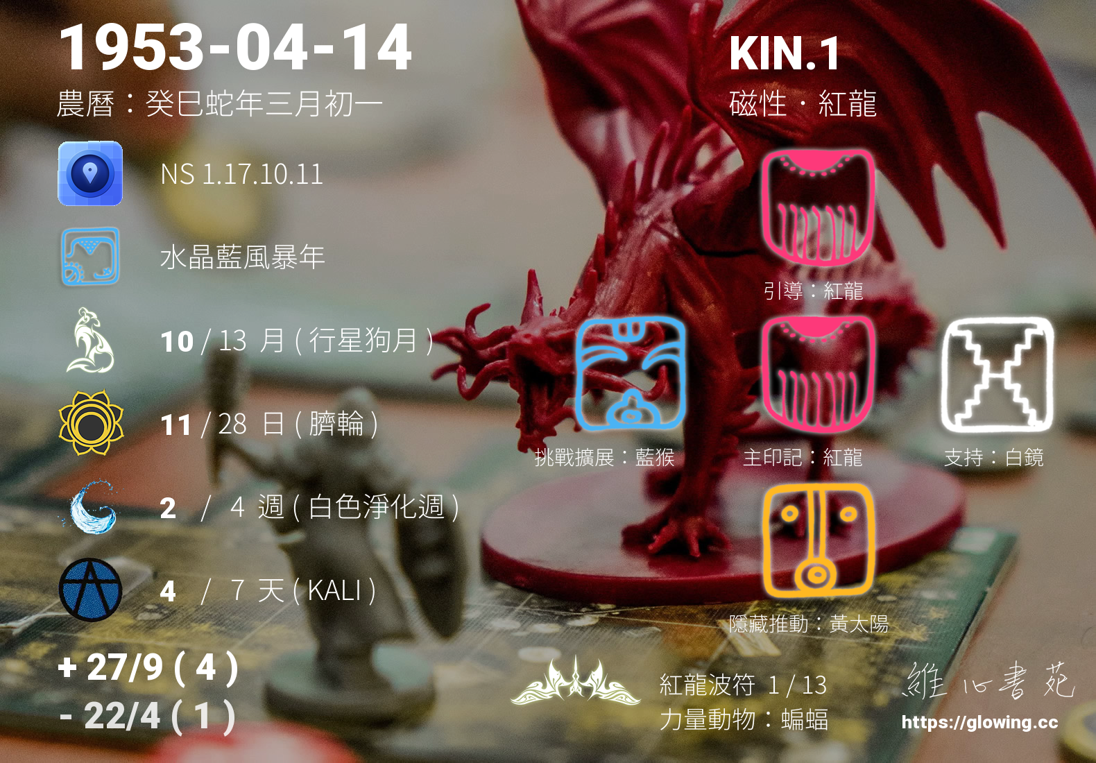 KIN.1 位於 紅龍波符 13 天中的第 1 天,銀河音階為調性 1
