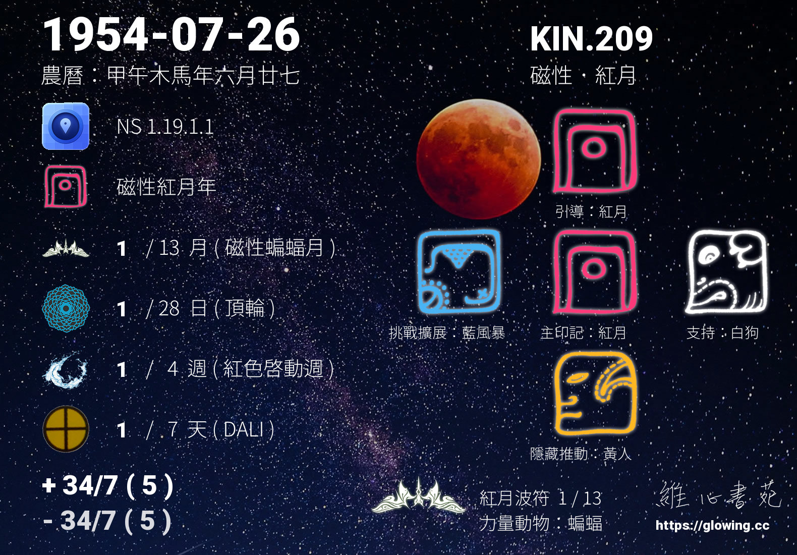 - PSI(行星記憶資料庫):KIN.1 磁性 紅龍
