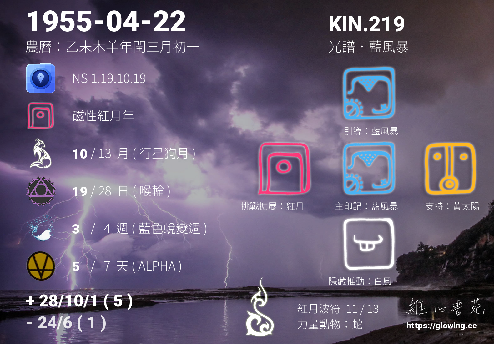 我們可以稱 KIN 219 為 【光譜藍風暴】 、 【光譜的藍風暴】 、 【紅月波符 之 光譜藍風暴】 也可以是 【光譜藍風暴.紅月波符】 ,你比較喜歡哪一個稱號呢?