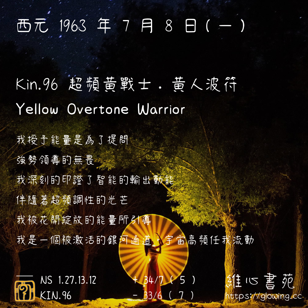 我們可以稱 KIN 96 為 【超頻黃戰士】 、 【超頻的黃戰士】 、 【黃人波符 之 超頻黃戰士】 也可以是 【超頻黃戰士.黃人波符】 ,你比較喜歡哪一個稱號呢?