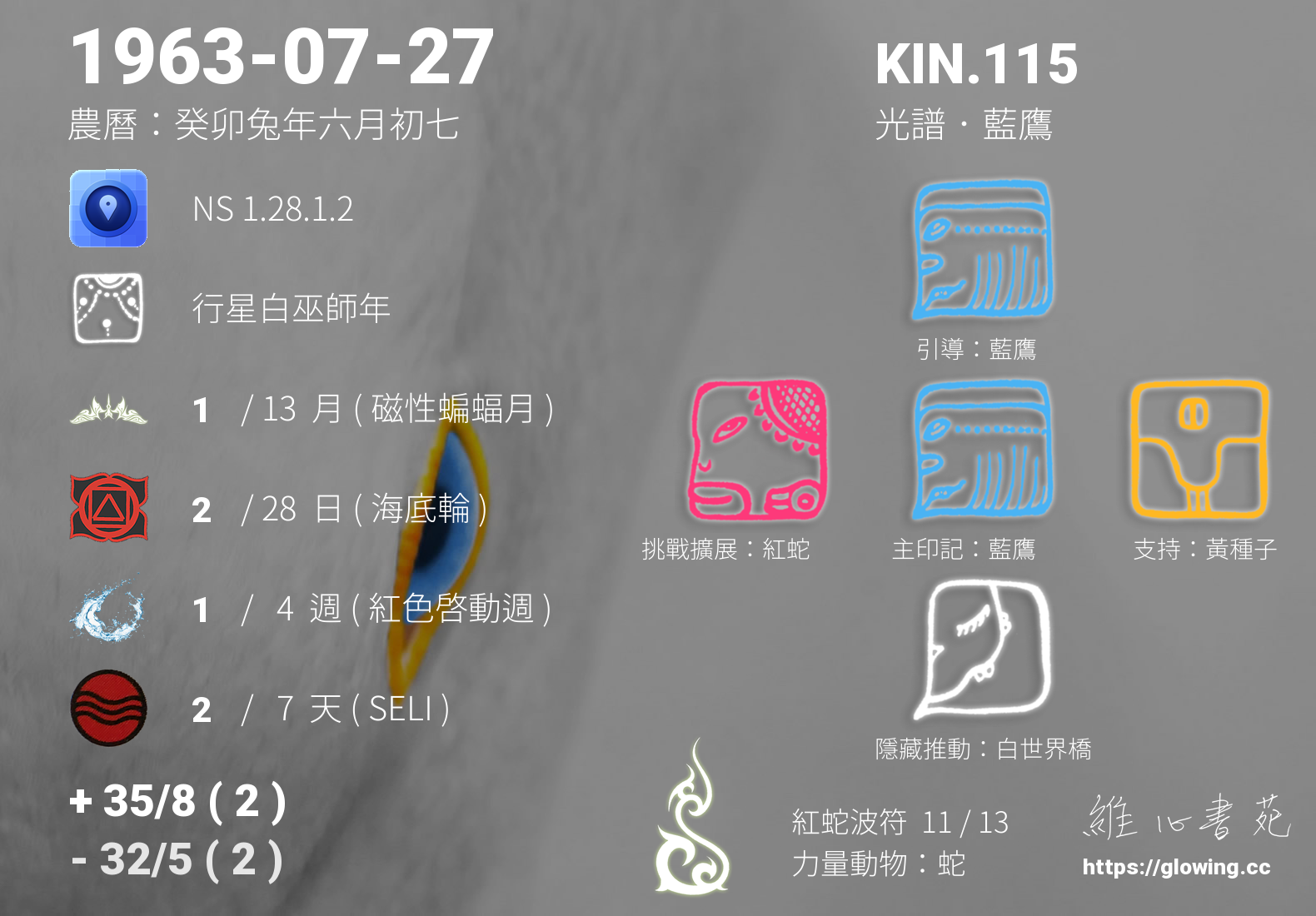 我們可以稱 KIN 115 為 【光譜藍鷹】 、 【光譜的藍鷹】 、 【紅蛇波符 之 光譜藍鷹】 也可以是 【光譜藍鷹.紅蛇波符】 ,你比較喜歡哪一個稱號呢?