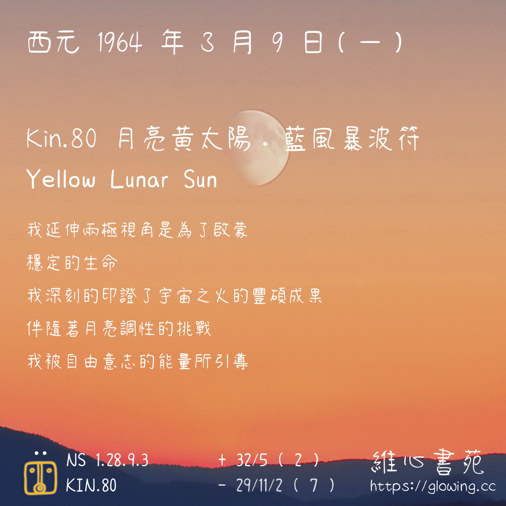 我們可以稱 KIN 80 為 【月亮黃太陽】 、 【月亮的黃太陽】 、 【藍風暴波符 之 月亮黃太陽】 也可以是 【月亮黃太陽.藍風暴波符】 ,你比較喜歡哪一個稱號呢?