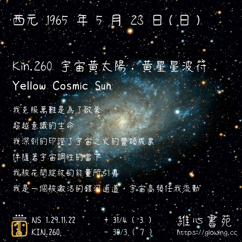 我們可以稱 KIN 260 為 【宇宙黃太陽】 、 【宇宙的黃太陽】 、 【黃星星波符 之 宇宙黃太陽】 也可以是 【宇宙黃太陽.黃星星波符】 ,你比較喜歡哪一個稱號呢?