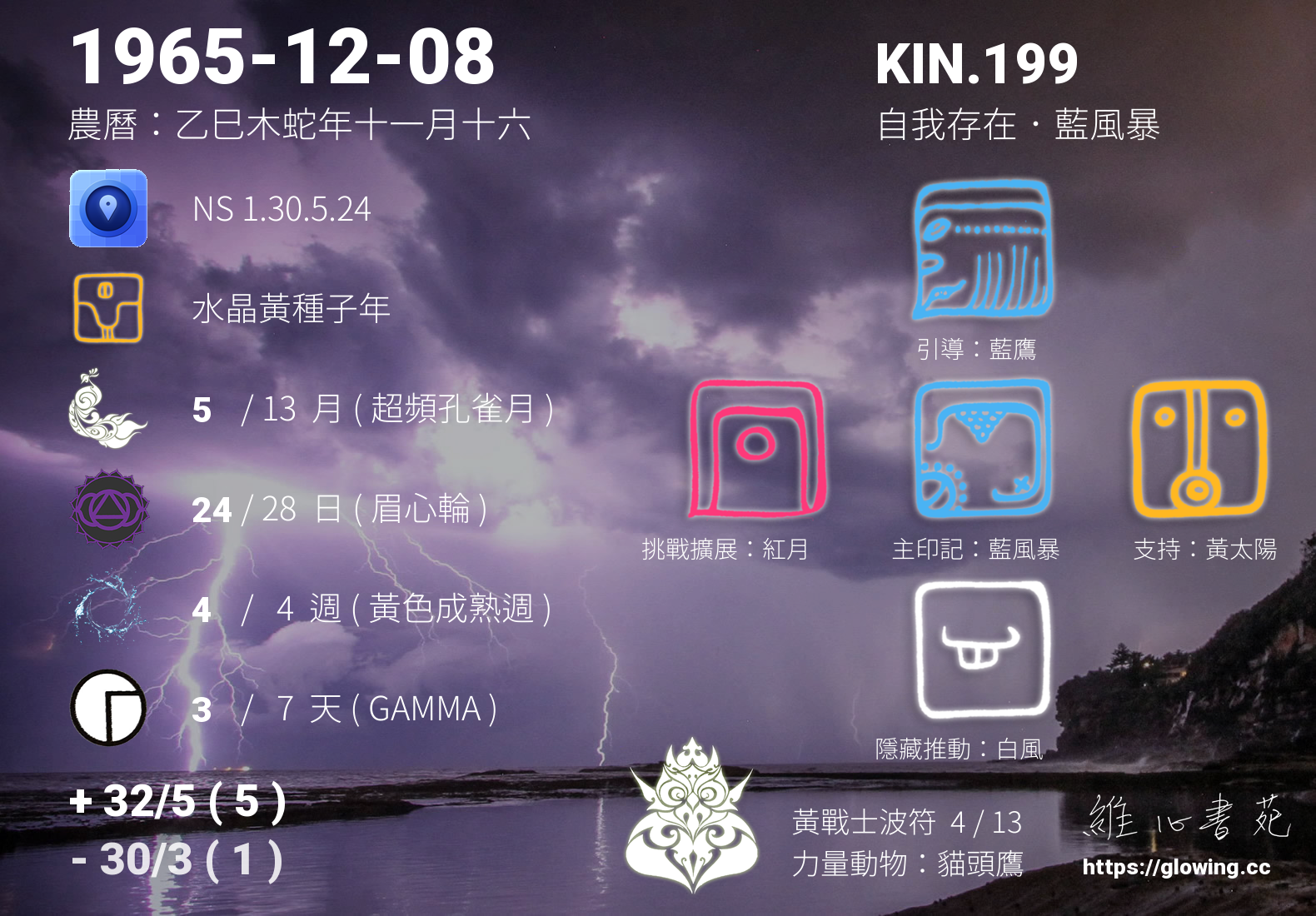 我們可以稱 KIN 199 為 【自我存在藍風暴】 、 【自我存在的藍風暴】 、 【黃戰士波符 之 自我存在藍風暴】 也可以是 【自我存在藍風暴.黃戰士波符】 ,你比較喜歡哪一個稱號呢?