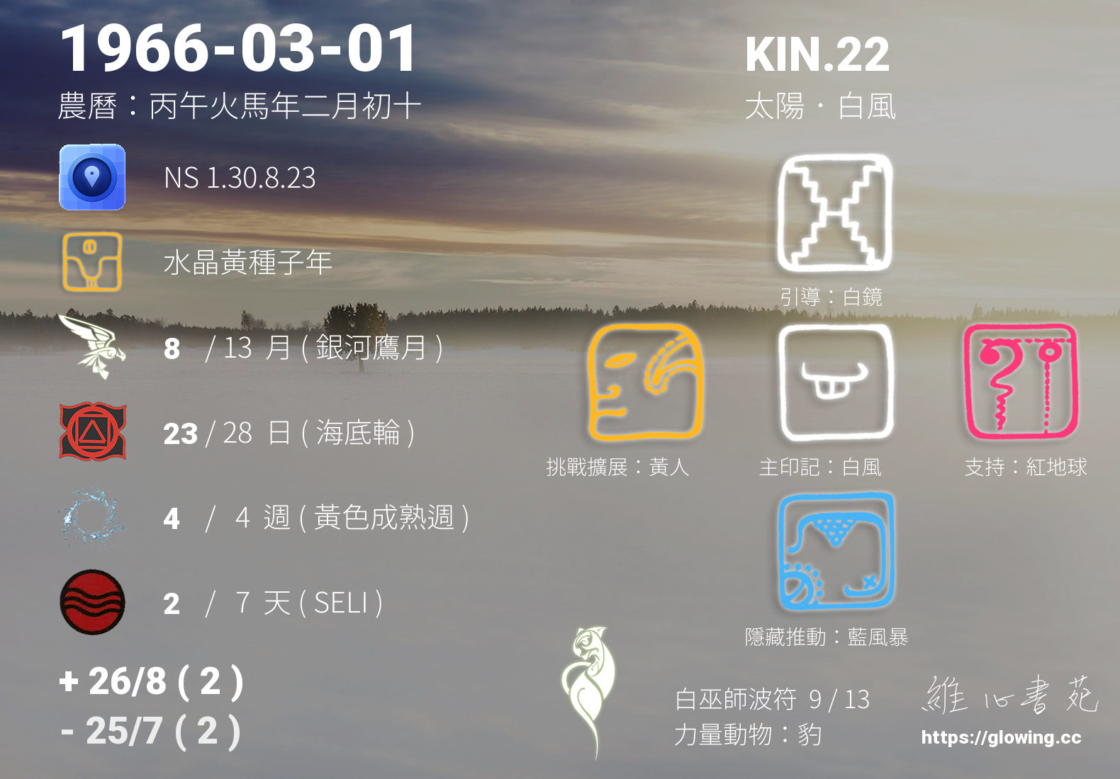 白風的引導依據KIN的調性不同會有五種可能性,KIN.22的引導圖騰是白鏡 , 白鏡引導著我們認清自我,為我們的未來留下紀錄,將我們每一個思緒紀錄在天體運行中,在我們回歸的那個當下,迴向各所有的存在與眾生,為這個世界留下美麗色彩。