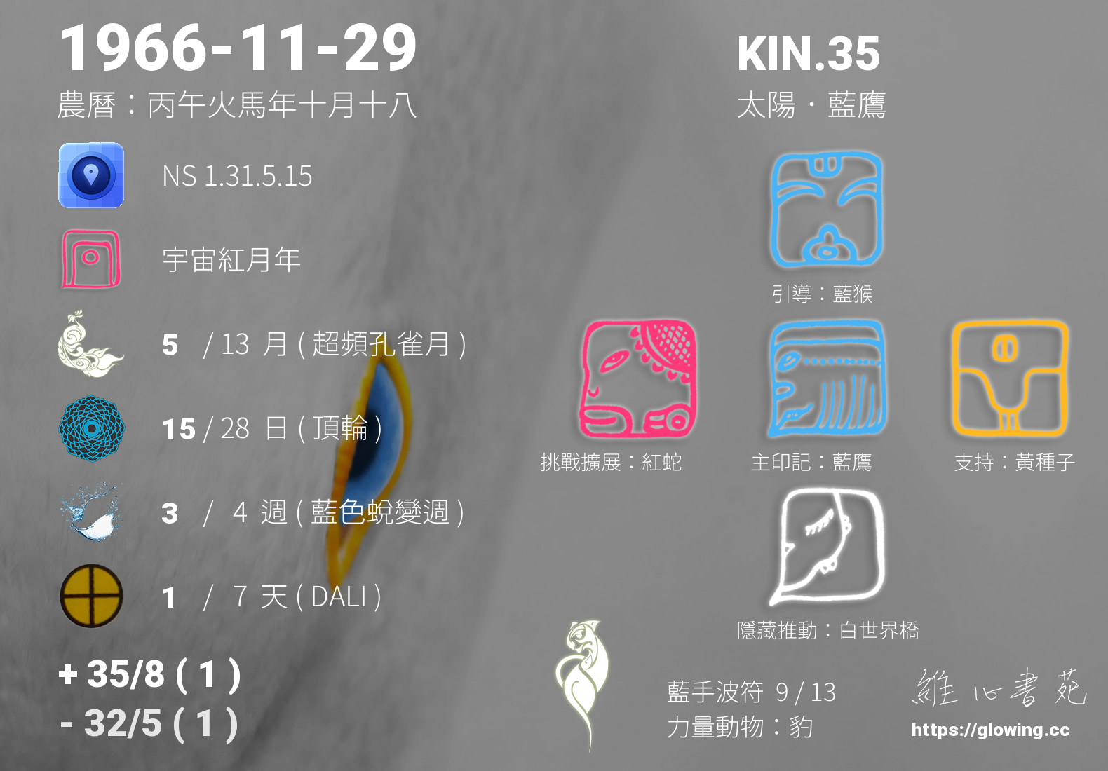 我們可以稱 KIN 35 為 【太陽藍鷹】 、 【太陽的藍鷹】 、 【藍手波符 之 太陽藍鷹】 也可以是 【太陽藍鷹.藍手波符】 ,你比較喜歡哪一個稱號呢?