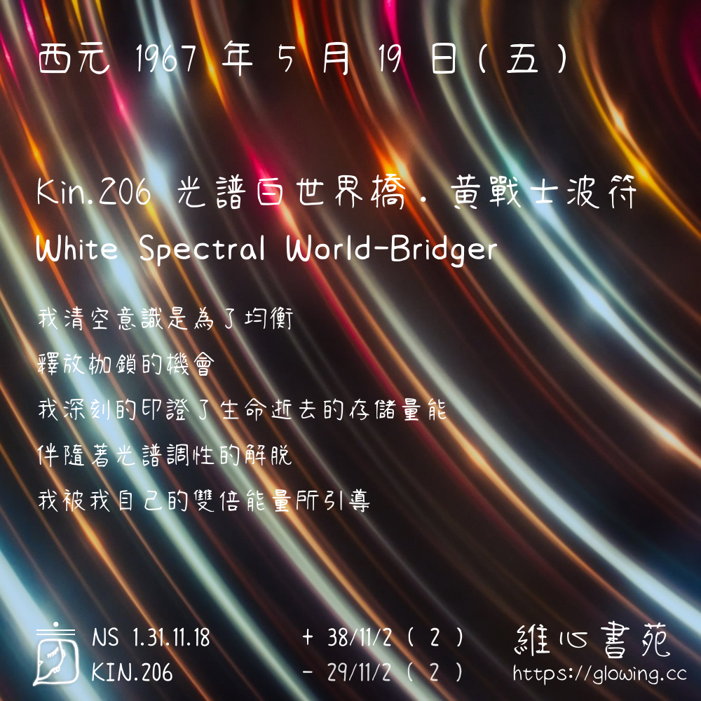 我們可以稱 KIN 206 為 【光譜白世界橋】 、 【光譜的白世界橋】 、 【黃戰士波符 之 光譜白世界橋】 也可以是 【光譜白世界橋.黃戰士波符】 ,你比較喜歡哪一個稱號呢?