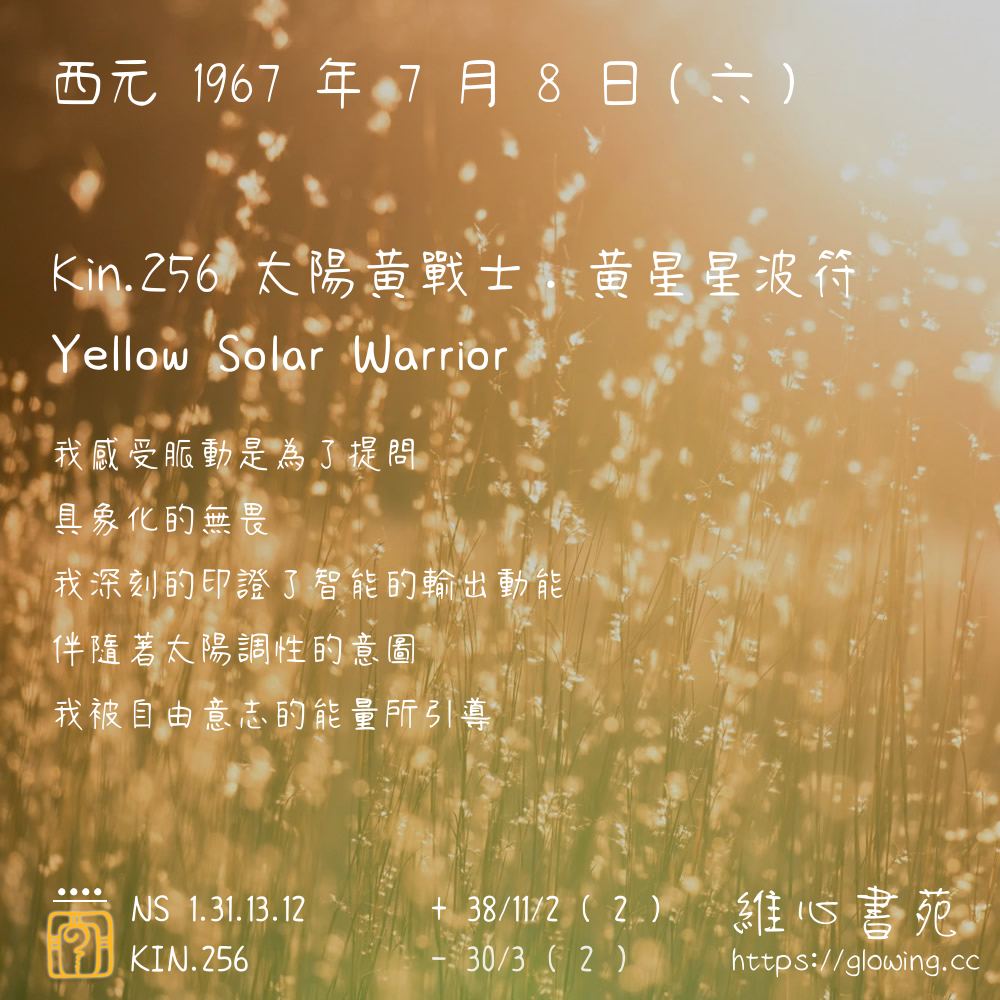我們可以稱 KIN 256 為 【太陽黃戰士】 、 【太陽的黃戰士】 、 【黃星星波符 之 太陽黃戰士】 也可以是 【太陽黃戰士.黃星星波符】 ,你比較喜歡哪一個稱號呢?