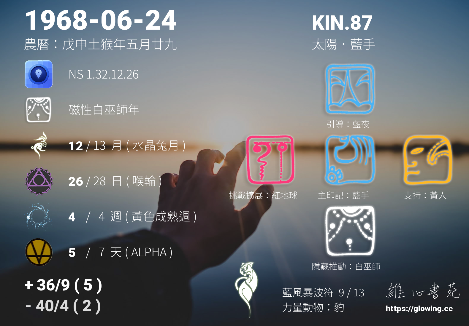 我們可以稱 KIN 87 為 【太陽藍手】 、 【太陽的藍手】 、 【藍風暴波符 之 太陽藍手】 也可以是 【太陽藍手.藍風暴波符】 ,你比較喜歡哪一個稱號呢?