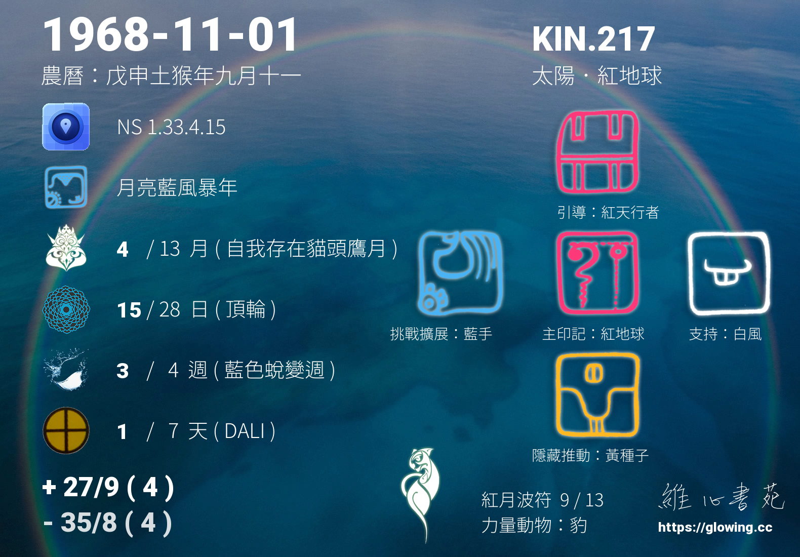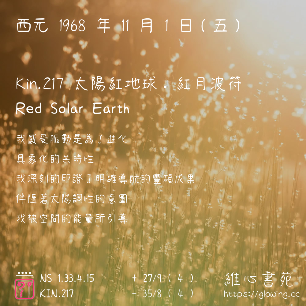 我們可以稱 KIN 217 為 【太陽紅地球】 、 【太陽的紅地球】 、 【紅月波符 之 太陽紅地球】 也可以是 【太陽紅地球.紅月波符】 ,你比較喜歡哪一個稱號呢?