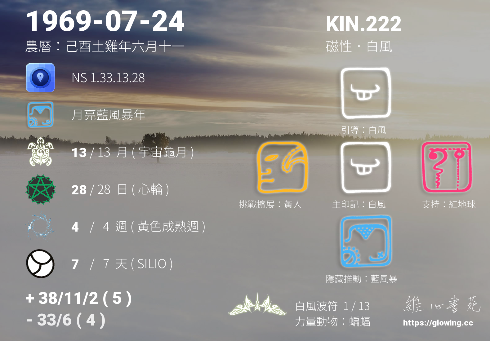 KIN.222 位於 白風波符 13 天中的第 1 天,銀河音階為調性 1