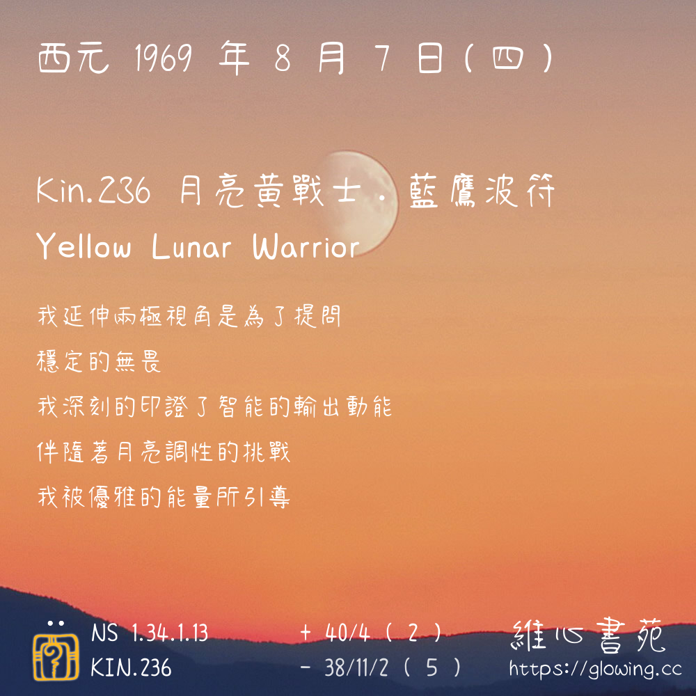 我們可以稱 KIN 236 為 【月亮黃戰士】 、 【月亮的黃戰士】 、 【藍鷹波符 之 月亮黃戰士】 也可以是 【月亮黃戰士.藍鷹波符】 ,你比較喜歡哪一個稱號呢?